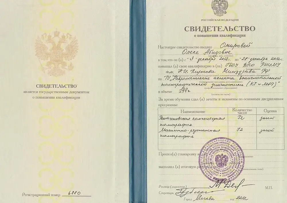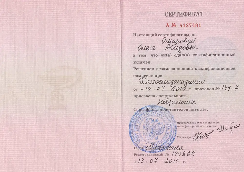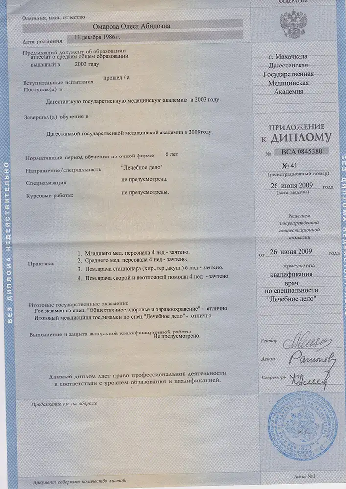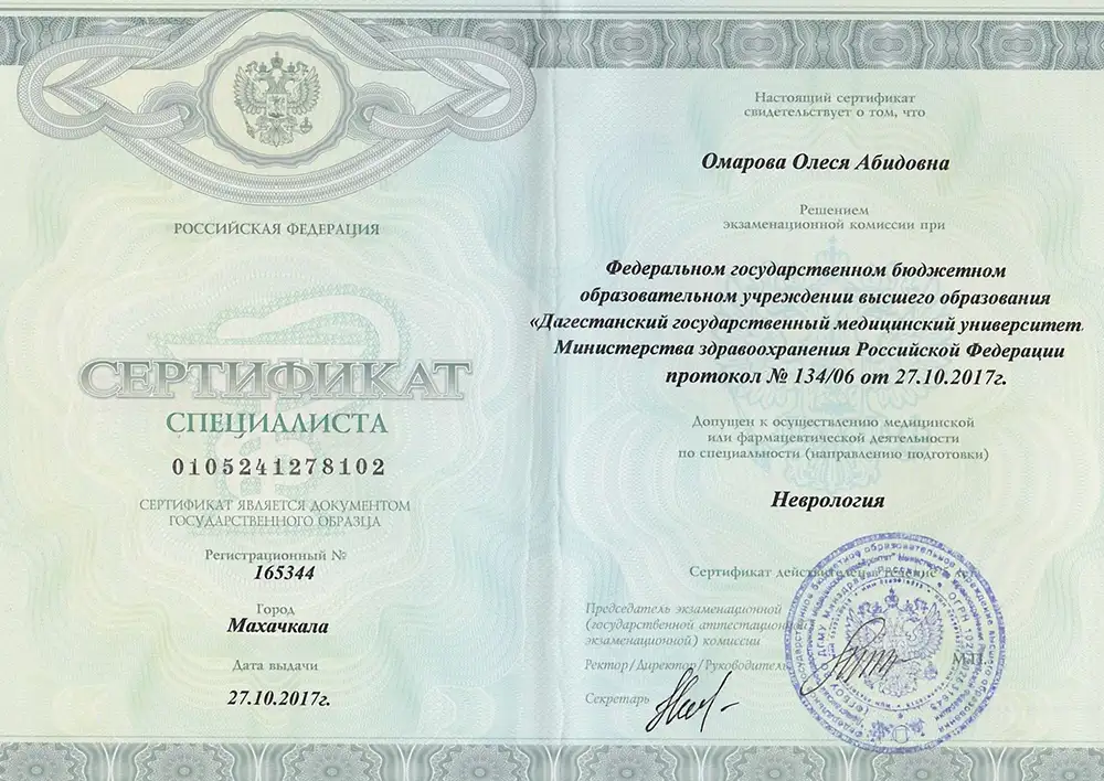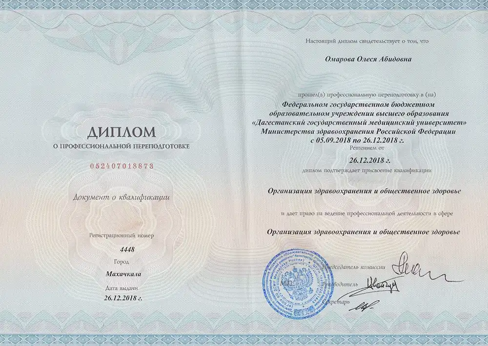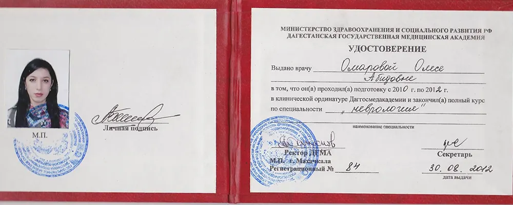 Окончила Дагестанскую Государственную Медицинскую Академию в 2009 году по специальности «Лечебное дело». В 2009-2010, 2010-2012 гг. прошла клиническую ординатуру на базе кафедры неврологии ФПК и ППС ДГМА по специальности «Неврология». В 2017 году – курсы повышения квалификации по специальности «Неврология» на базе кафедры неврологии ФПК и ППС ДГМА.