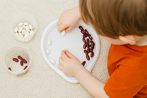 - «Волшебные коробочки». Возьмите несколько непрозрачных контейнеров и наполните их разными по ощущению материалами: крупами, фасолью, кинетическим песком, ватными или гидрогелевыми шариками, пуговицами и другими безопасными мелкими предметами, знакомыми малышу. Можно предлагать опускать руки внутрь, определять наполнители на ощупь, перебирать их, находить спрятанные фигурки. Такое занятие обычно вызывает интерес и при подходящем наполнителе помогает ребёнку расслабиться.