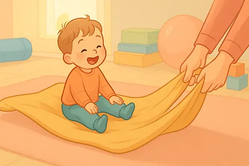 - «Ковёр-самолёт». Ребёнок садится или ложится на небольшое одеяло, а взрослый, держась за два конца, медленно и плавно катает его по комнате. Это даёт и проприоцептивную нагрузку, и вестибулярный опыт.