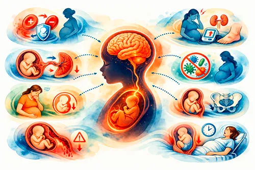 - Нефропатия беременных. Осложнение позднего токсикоза (обычно после 20-й недели), при котором появляются отёки, стойкое повышение давления и протеинурия. Само по себе оно не всегда является прямой причиной, но без коррекции увеличивает риск нарушений маточно-плацентарного кровотока, преждевременного родоразрешения и тяжёлых осложнений (включая эклампсию), что неблагоприятно отражается на нервной системе ребёнка.